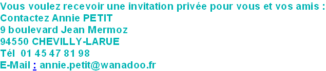annie petitEXPOSITION "NOEL 2018 A L'ATELIER"9, Boulevard Jean Mermoz94550 CHEVILLY-LARUE01 45 47 81 98 et 06 88 45 32 92Du Samedi 10 au Dimanche 18 Novembre 2018Vente privée uniquement sur invitation personnellede 13h30 à 19h